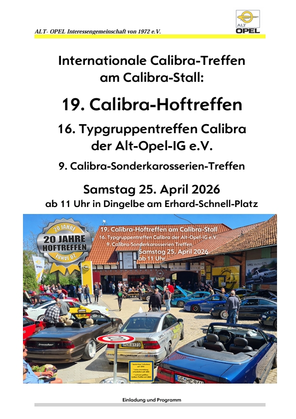 Samstag 25. April 2026 ab 11 Uhr in Dingelbe am Erhard-Schnell-Platz Hallo meine lieben Calibra-Freunde,kaum zu glauben, aber wahr: In diesem Jahr feiern wir das 20-jährige Jubiläum unseres Calibra-Hoftreffens!Das vergangene Jahr hat alle Erwartungen übertroffen: Mit 120 Gäste-Fahrzeugen haben wir 2025 einen epischen Besucherrekord aufgestellt!Mein aufrichtiger Dank und Respekt gilt allen Gästen, die von nah […]