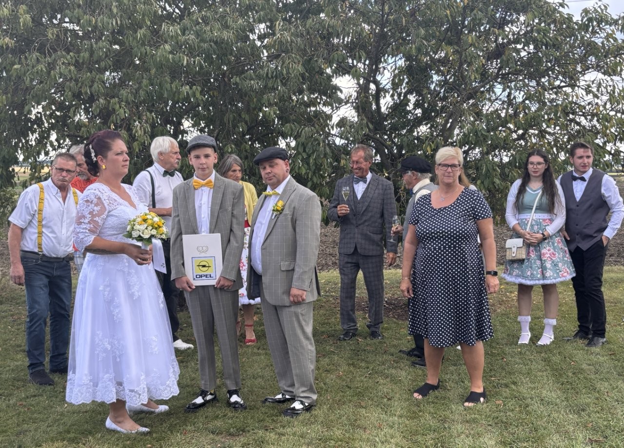 Am 06. 09. starteten wir zu unserer zweiten Ausfahrt zum Heurigen Loiskandl im 50er-Jahre-Outfit. Vor Ort wurden wir vom Hausherrn Josef Loiskandl in die Anforderungen des Weinbaues und die Herstellung eingeführt. Im Anschluss durften wir die unterirdischen Weinkeller besichtigen und eine Weinverkostung vornehmen. Danach fuhren wir eine kurze Strecke zum Kellerstöckl des Weingut Burger. Und jetzt pass auf!! Diese Besichtigung und kleine Ausfahrt diente eigentlich nur als Ablenkung für ein ganz besonderes Ereignis, nämlich der standesamtlichen Hochzeit von Sabrina Rath und Stefan Horvath!! Sie sind schon seit 15 Jahren ein Paar und haben sich im letzten Winter dazu entschlossen hier bei der Herbstfahrt zu heiraten. Diese Überraschung ist ihnen wahrlich gelungen. Dass die meisten natürlich komplett aus dem Häuschen waren ist verständlich, denn nur ein ganz kleiner Personenkreis war eingeweiht und um hier bis zum heutigen Tage dichtzuhalten war alles andere als leicht. Nun standen wir hier im Garten des Kellerstöckls und Werner Pirker agierte als Hochzeitslader, bevor die standesamtliche Trauung, durchgeführt durch den Hollabrunner Standesbeamten Herrn Josef Goll, begann. Als Trauzeugen fungierten Silvia und Anton Siedl, Sabrinas und Stefans Sohn Tobias überreichte die Ringe. Nach dieser herzlichen Zeremonie durften wir mit dem Hochzeitspaar anstoßen und unsere Glückwünsche übermitteln, natürlich gab es auch ein Gruppenfoto mit allen Feiergästen. Ganz besonders freute es uns, dass die beiden im Kreis des Alt-Opel-Stammtisches heiraten wollten.