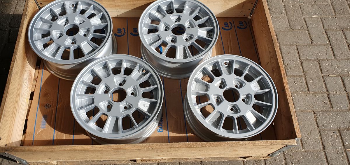 Vier Ersatzfelgen, Alufelgen 6×14 Ronal Kleeblatt, Neu bearbeitet, gewuchtet, neu pulverbeschichtet durch Fachbetrieb. Felgen wurden ab Werk etwa Bj. 1976 auf diesem Modell gefahren.