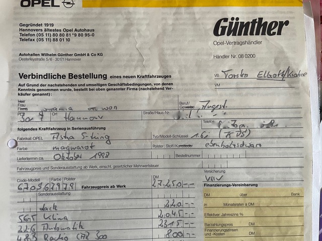 Ich biete einen Opel Astra 1,6i 5-türig, Klima, Automatik, innen schwarz, 1.Hd, 38.850km, Jahreswagenzustand, TÜV neu, noch mit Werkswachs am Antrieb als zukünftigen Oldtimer. Preis 4600€