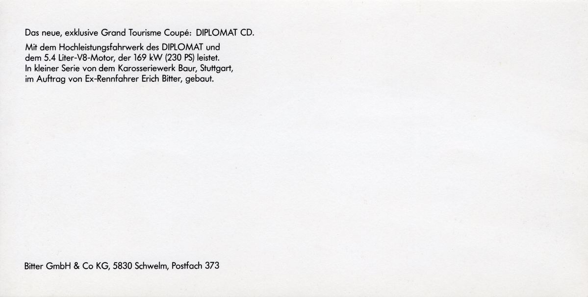 Der Bitter CD ist eine Legende im Opel-Cosmos. Der Wagen wurde entwickelt und konstuiert vom ehemaligen Rennfahrer Erich Bitter. Dieser gab auch den Auftrag zum Bau einer Kleinserie an das Karosseriewerk Baur in Stuttgart. Mit dem Siegel der Bitter GmbH & Co KG garantiert dieses Dokument Authentizität und ein Stück gelebte Automobilgeschichte.