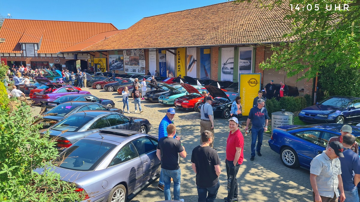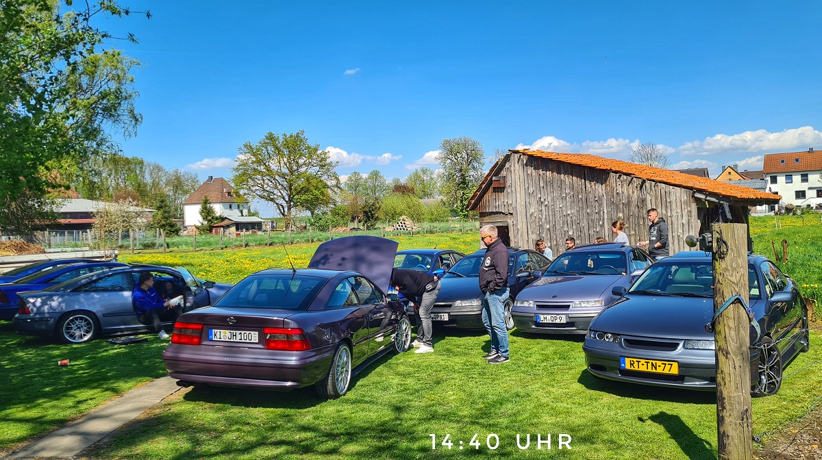Als 120. Fahrzeug konnte ich gegen 14 Uhr dann Eckhart Bartels mit seinem Cabriolet begrüßen. Der Hof war vollends voll, hinter dem Calibra-Stall standen einige Oldtimer und auf der Weide auf der spontan eingerichteten Ausweichfläche weitere Fahrzeuge.