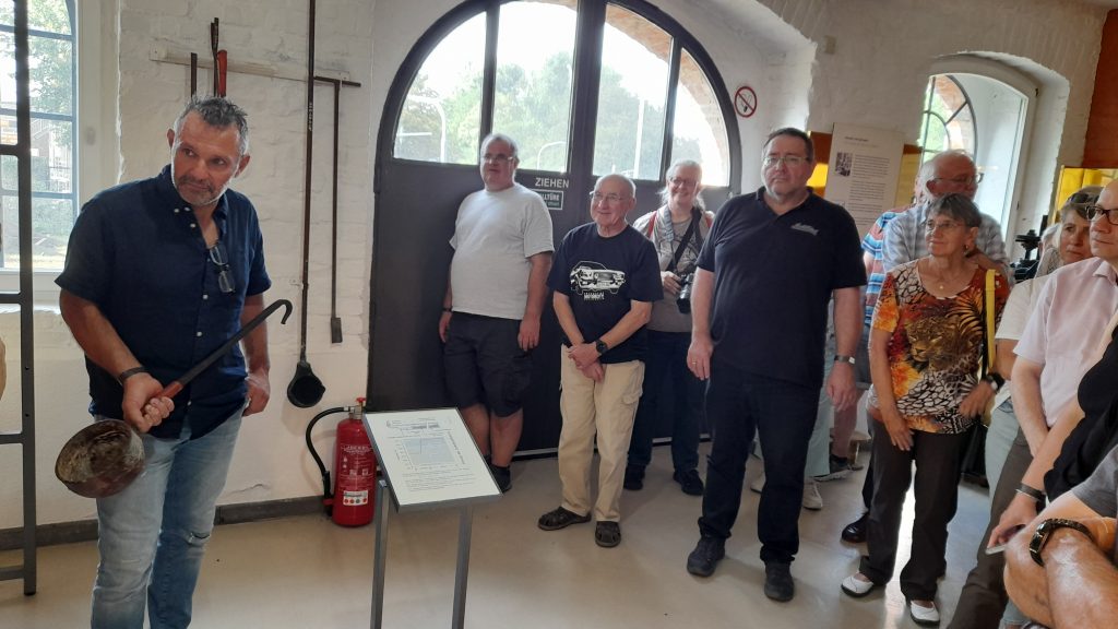 Erster Programmpunkt war am Nachmittag der Besuch vom Zinkhütter Hof, einem Museum für Industrie- und Wirtschaftsgeschichte der Region. Dauerausstellungen erklären die Gewinnung und Verarbeitung von Zink und Messing, die Herstellung von Nadeln und die lange Geschichte des Fahrzeugbaus. 1896 begann ein Nadel-Hersteller mit der Produktion von Speichen, Nippeln und Kugeln. Ab 1897 baute Cudell & Co. zunächst Motoren und Fahrzeugteile, später auch Fahrzeuge. Mit Cudell, Fafnir und Mannesmann-Mulag hatte die Region bis zur Weltwirtschaftskrise gleich drei bedeutende Autobauer, die weltweit exportierten.