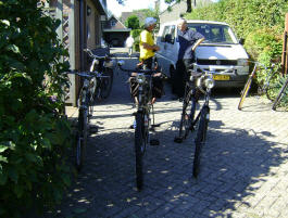 Alle 18 Radfahrer, von denen 10 mit einem original Opel Fahrrad angereist waren, wurden am Sonntagmorgen um 11 Uhr, mit Kaffee und Kuchen, im Garten von Jacqueline und Fred empfangen. Das es fabelhaftes Wetter werden sollte, war schon an der recht hohen Temperatur Frühmorgens abzusehen. Das hatte aber manchen Teilnehmer nicht davon abgehalten historisch gekleidet mitzufahren. Obwohl diese Kleidung mehr für niedrigere Temperaturen geeignet ist. Die Radfahrer aus Luxemburg und Deutschland, die mit originalen Halbrenner von Opel mitfuhren, trugen eine Sportausstattung so wie diese damals beim Basel-Kleve Fahrradrennen verwendet worden war. Obwohl nicht von Opel, aber dennoch etwas besonderes, war das Royal Hunter Tandem von 1936 womit Frau und Tochter von Arjan van Werde mitfuhren.