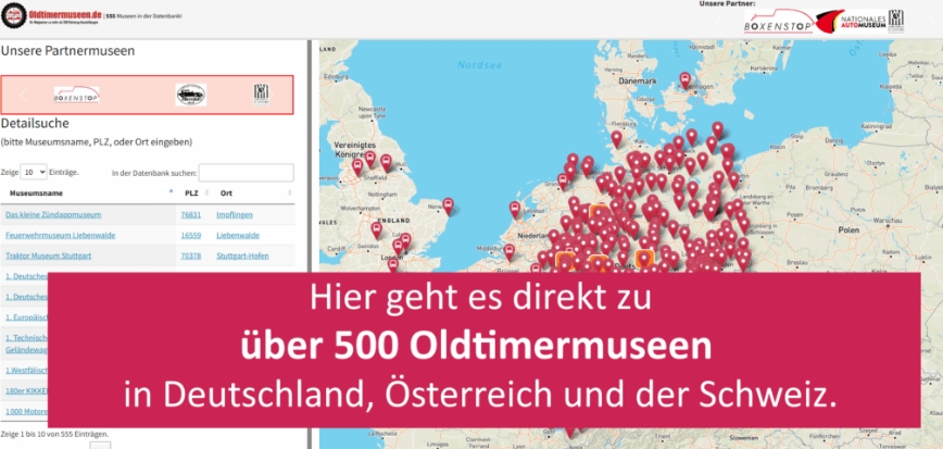 wir möchten Sie darüber informieren, dass auf oldtimermuseen.de inzwischen über 500 Oldtimermuseen aus Deutschland, Österreich und der Schweiz gelistet sind. Bisher waren auf der Seite ausschließlich deutsche Museen aufgeführt – das Angebot wurde nun deutlich erweitert und aktualisiert.